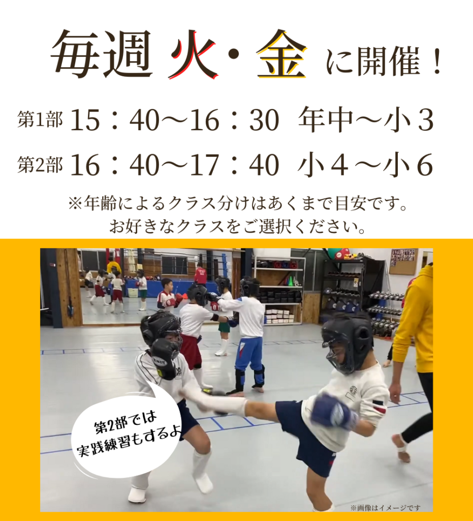 15:40 ~ 16:30の前半クラスでは、キックボクシングの練習だけでなく、子どもが喜ぶ遊びなどを取り入れ、運動に対して前向きな気持ちをはぐくみます。